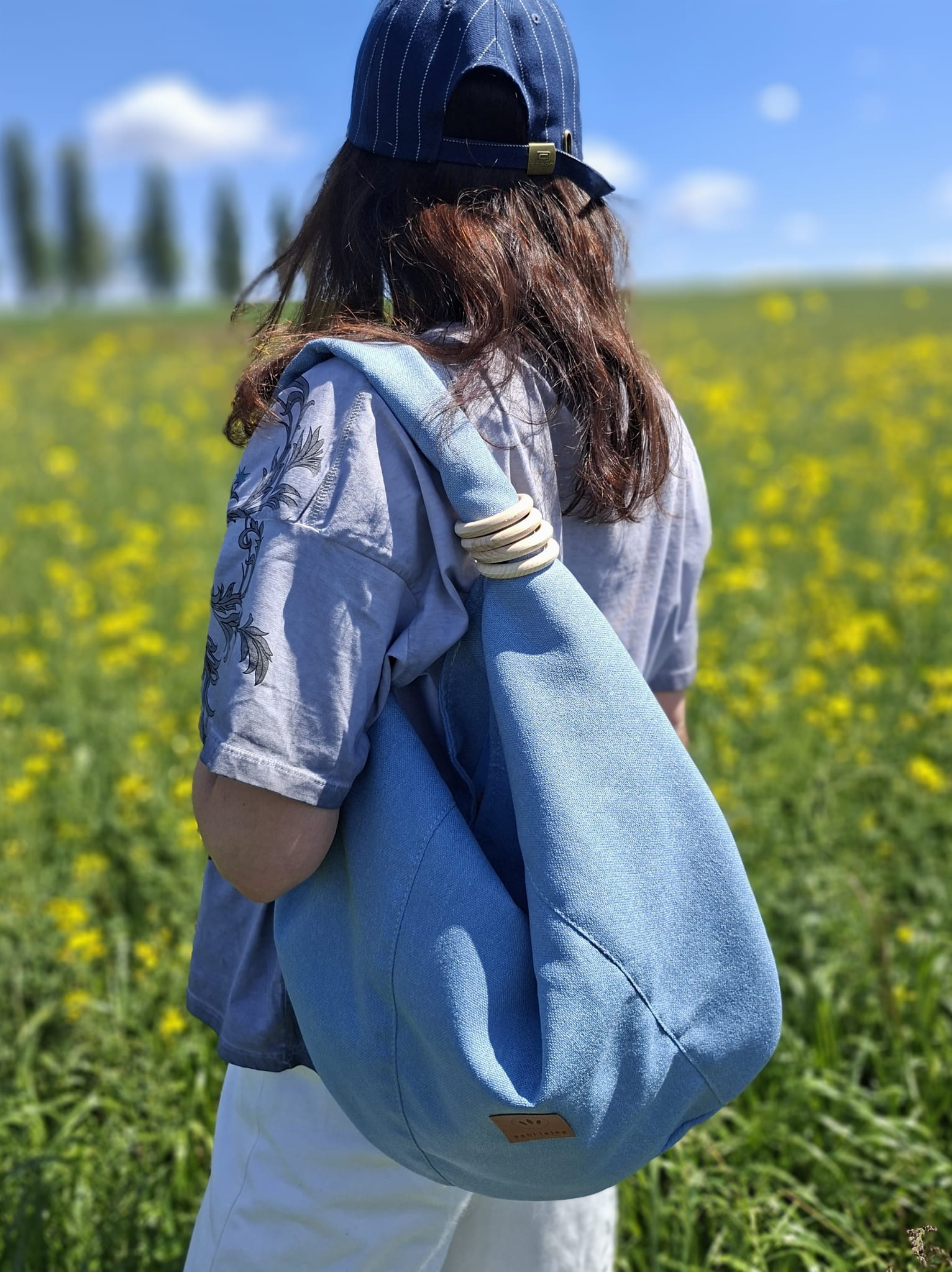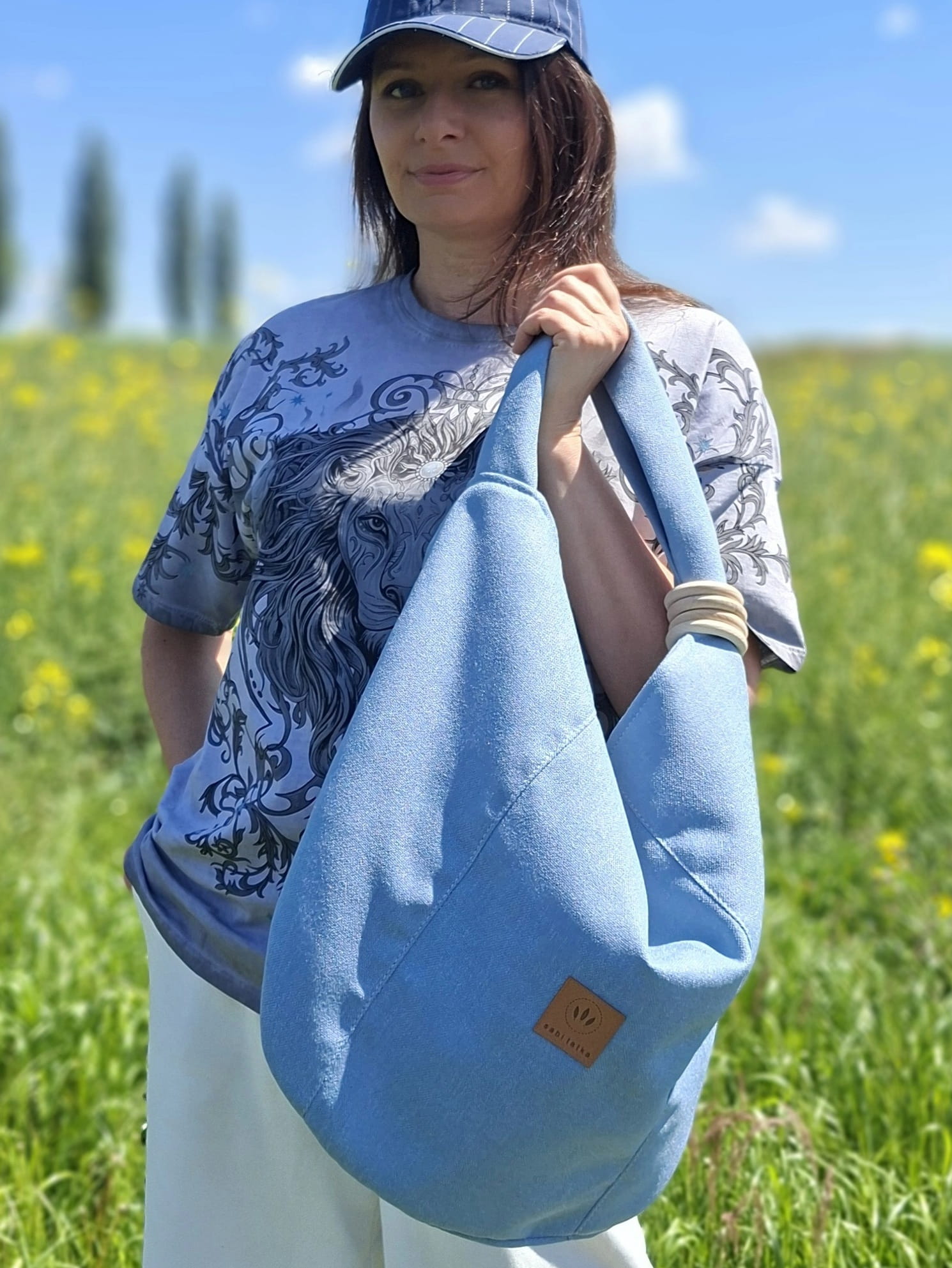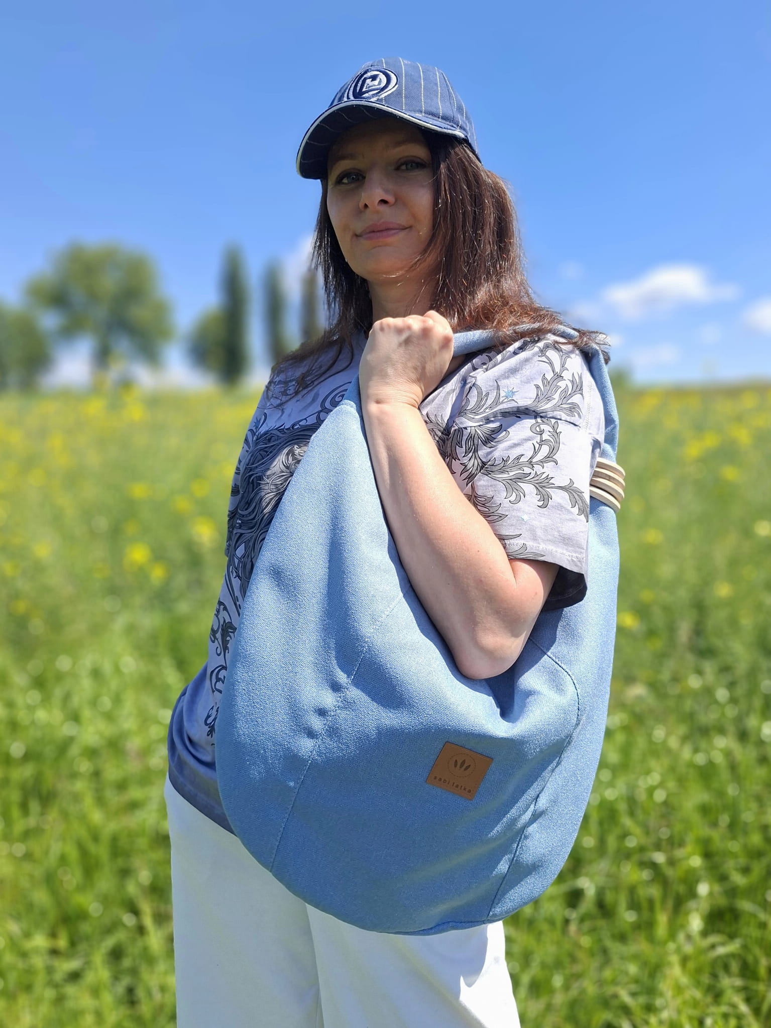 Duża torebka worek z plecionej tkaniny tapicerskiej przypominającej len.