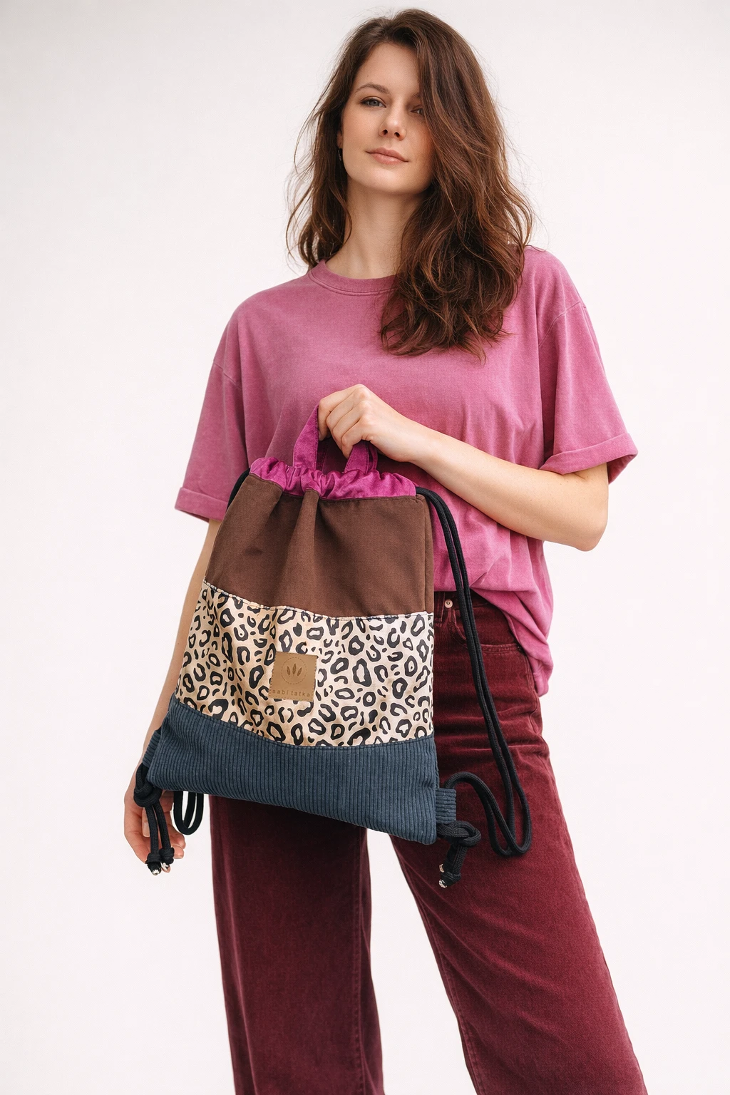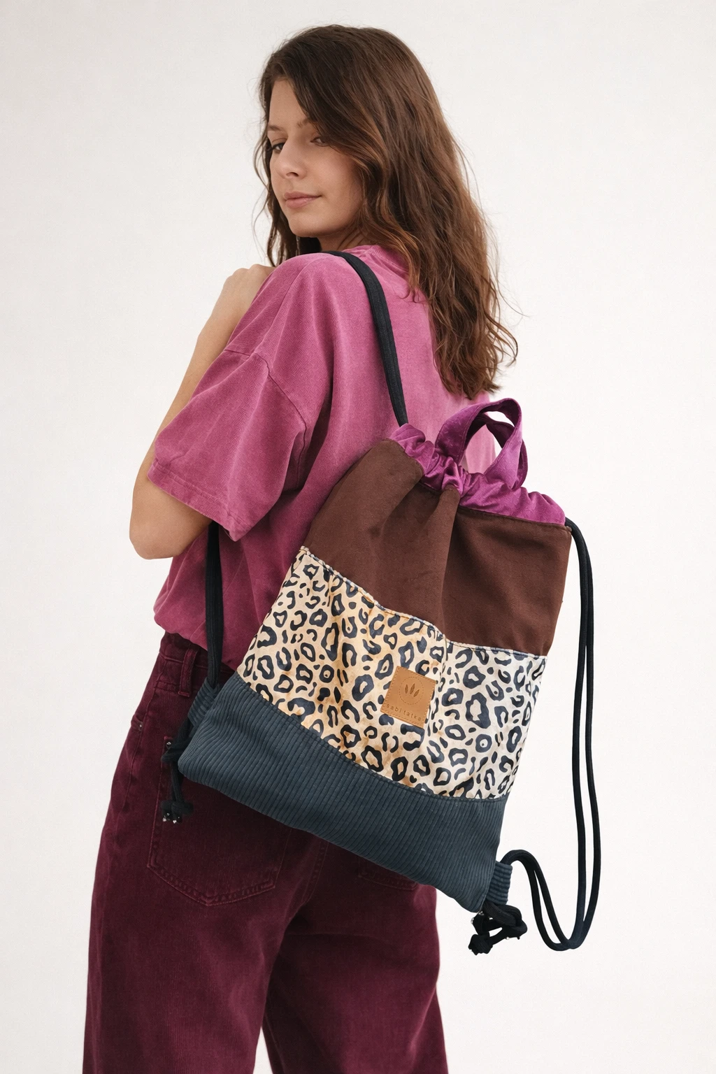 Kolorowy plecak worek z modnym motywem panterki, łączący różne faktury i odcienie.