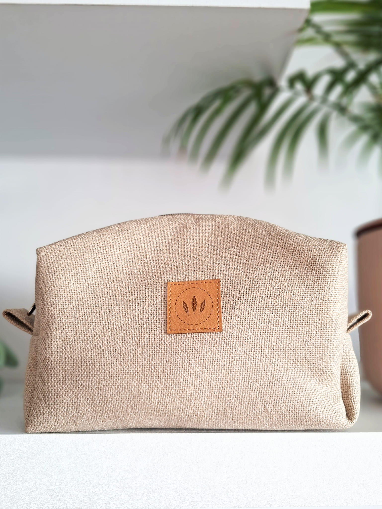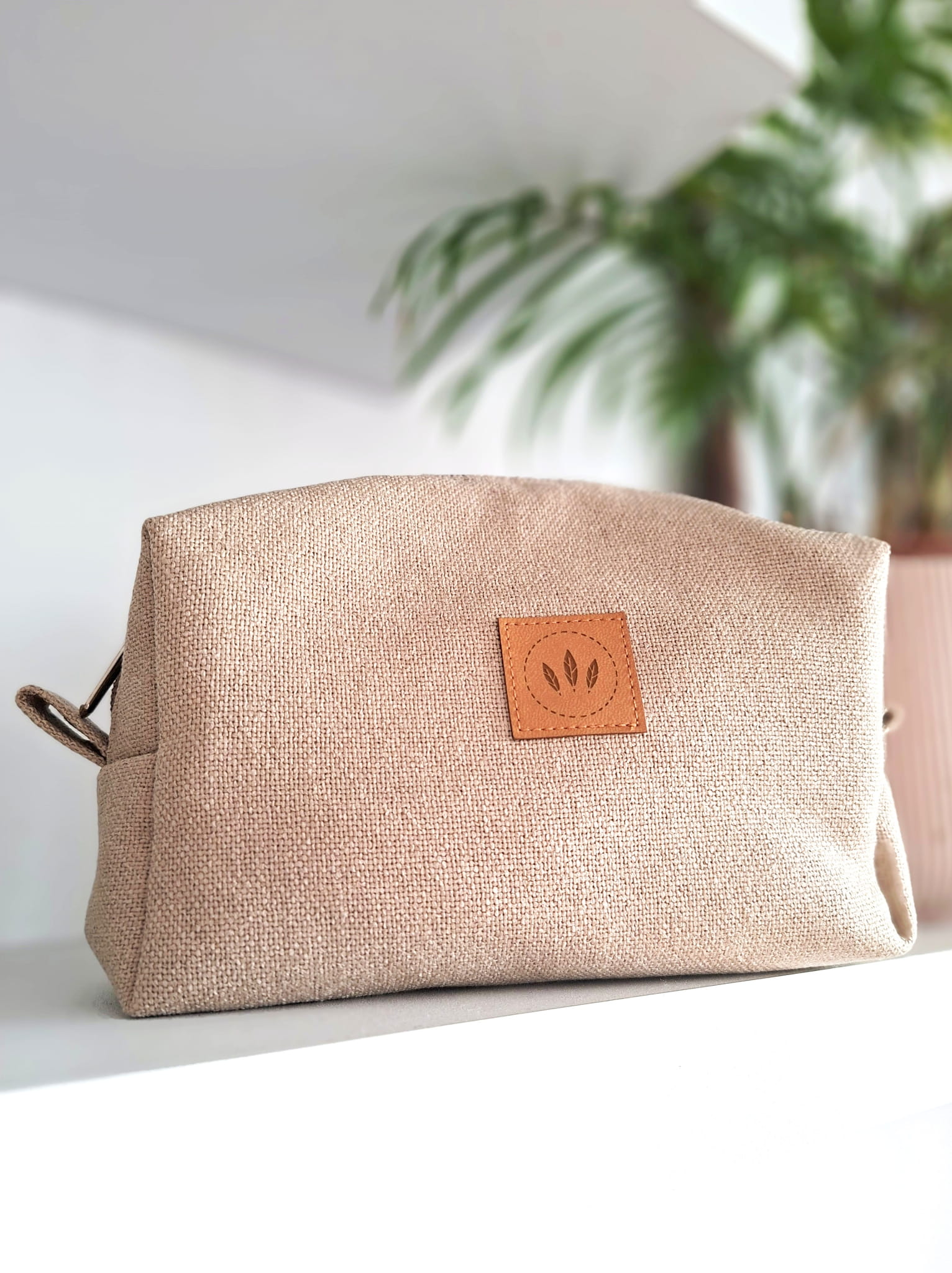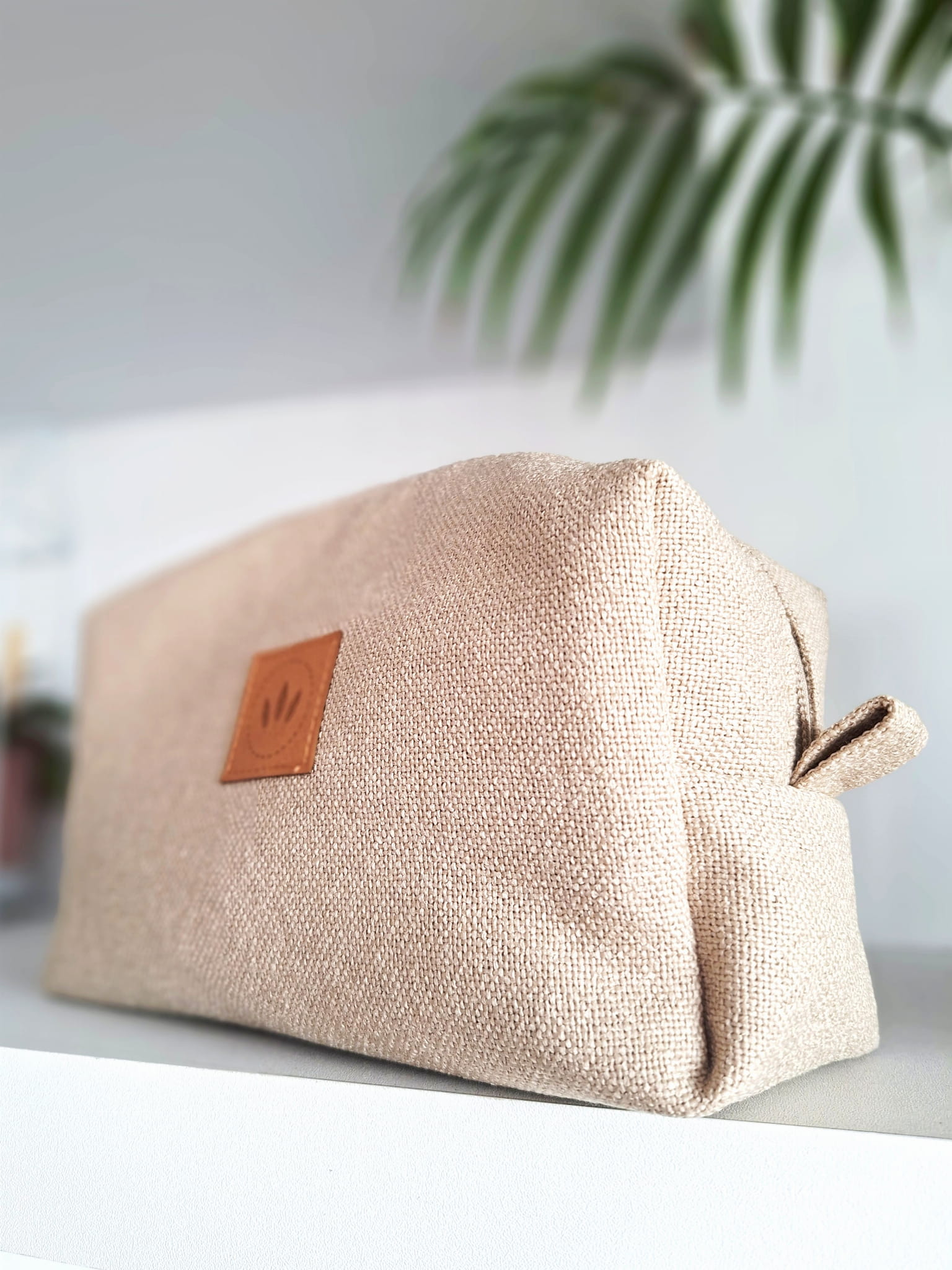 Średniej wielkości kosmetyczka z plecionej tkaniny tapicerskiej imitującej len.