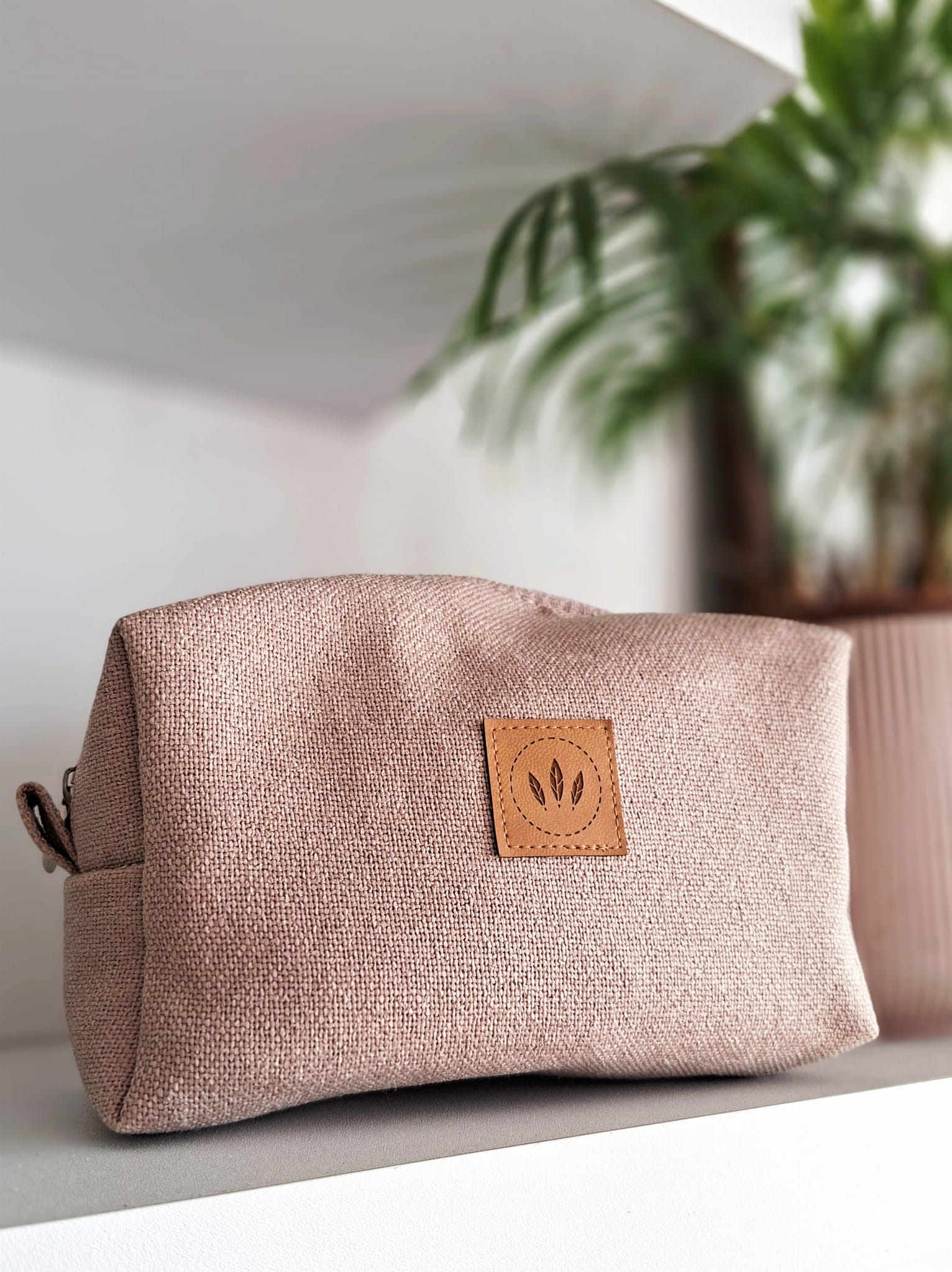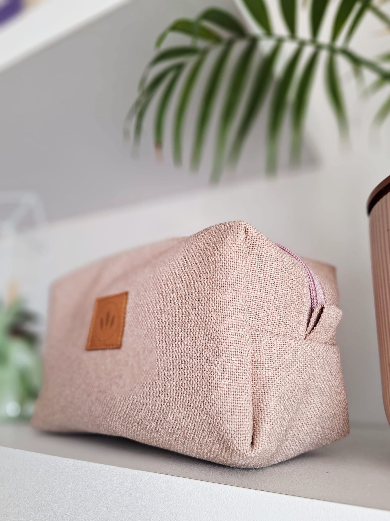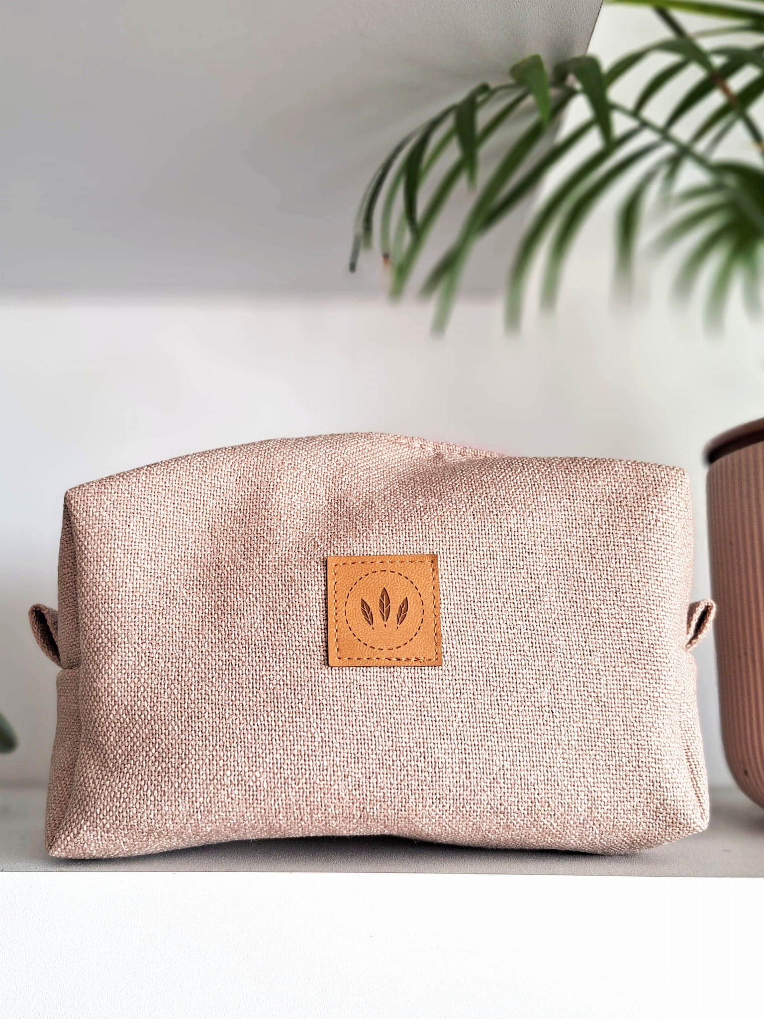 Średniej wielkości kosmetyczka z plecionej tkaniny tapicerskiej imitującej len.