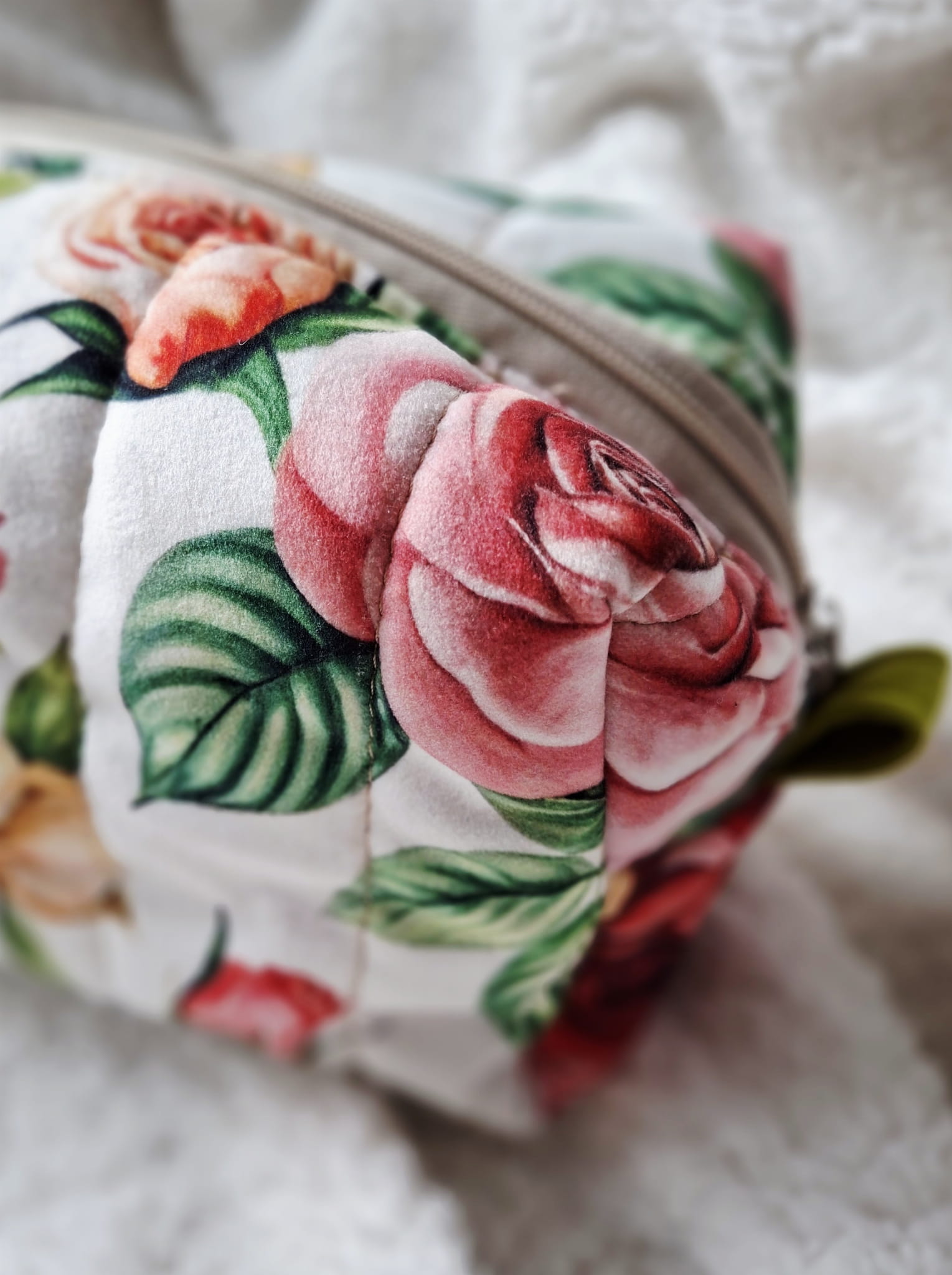 Delikatny motyw róż w nasyconych odcieniach nadaje kosmetyczce elegancki, kobiecy charakter i sprawia, że wyróżnia się spośród klasycznych modeli.