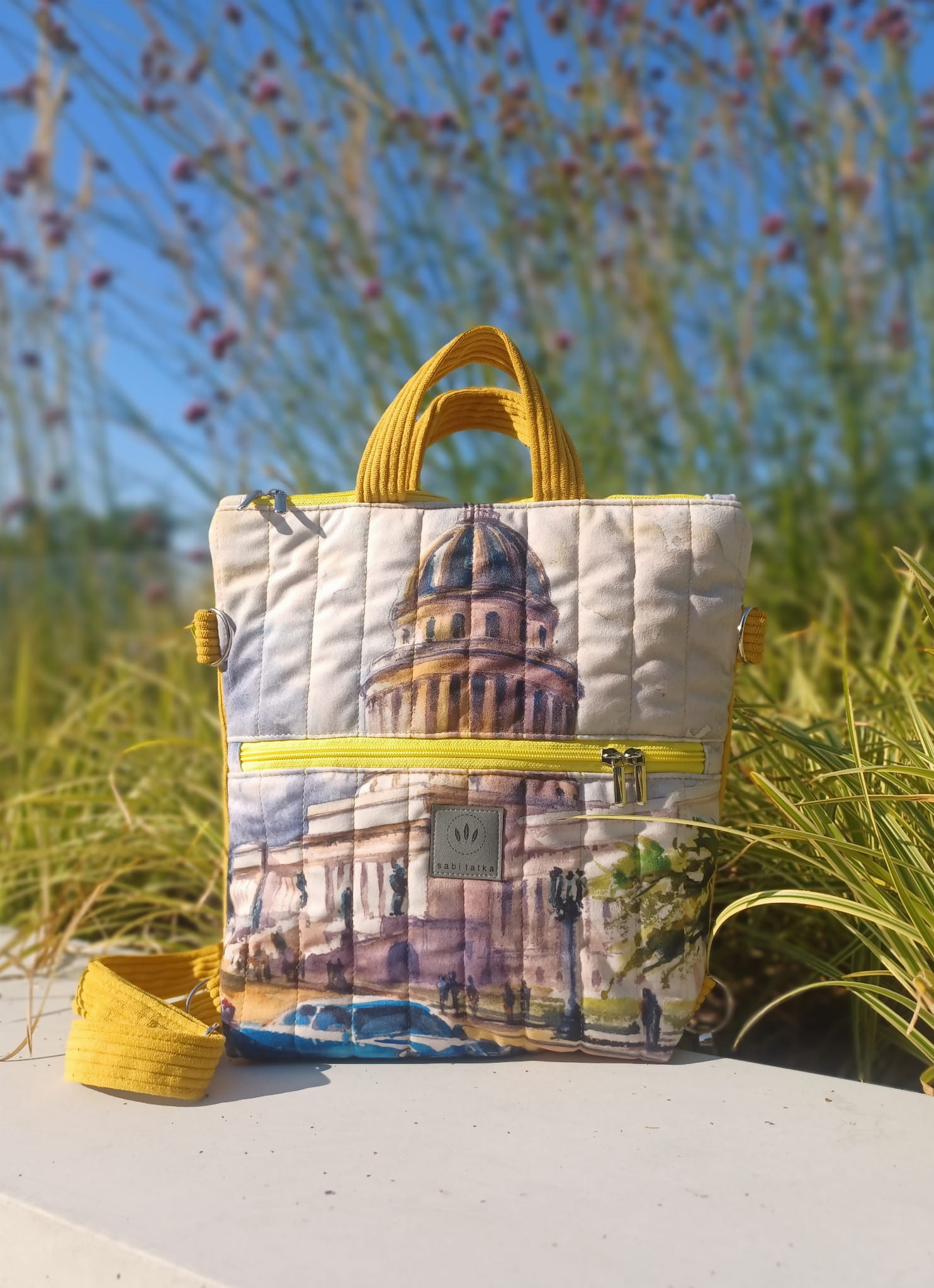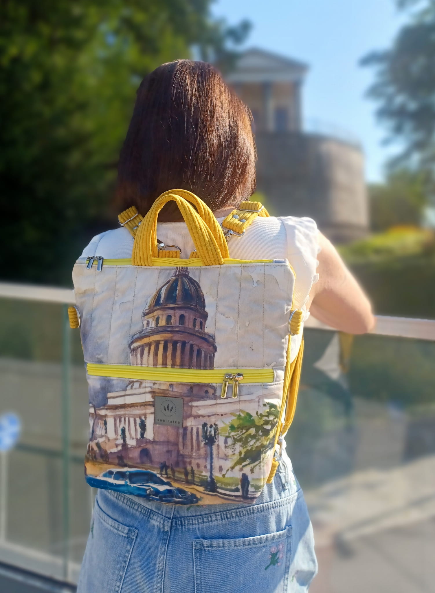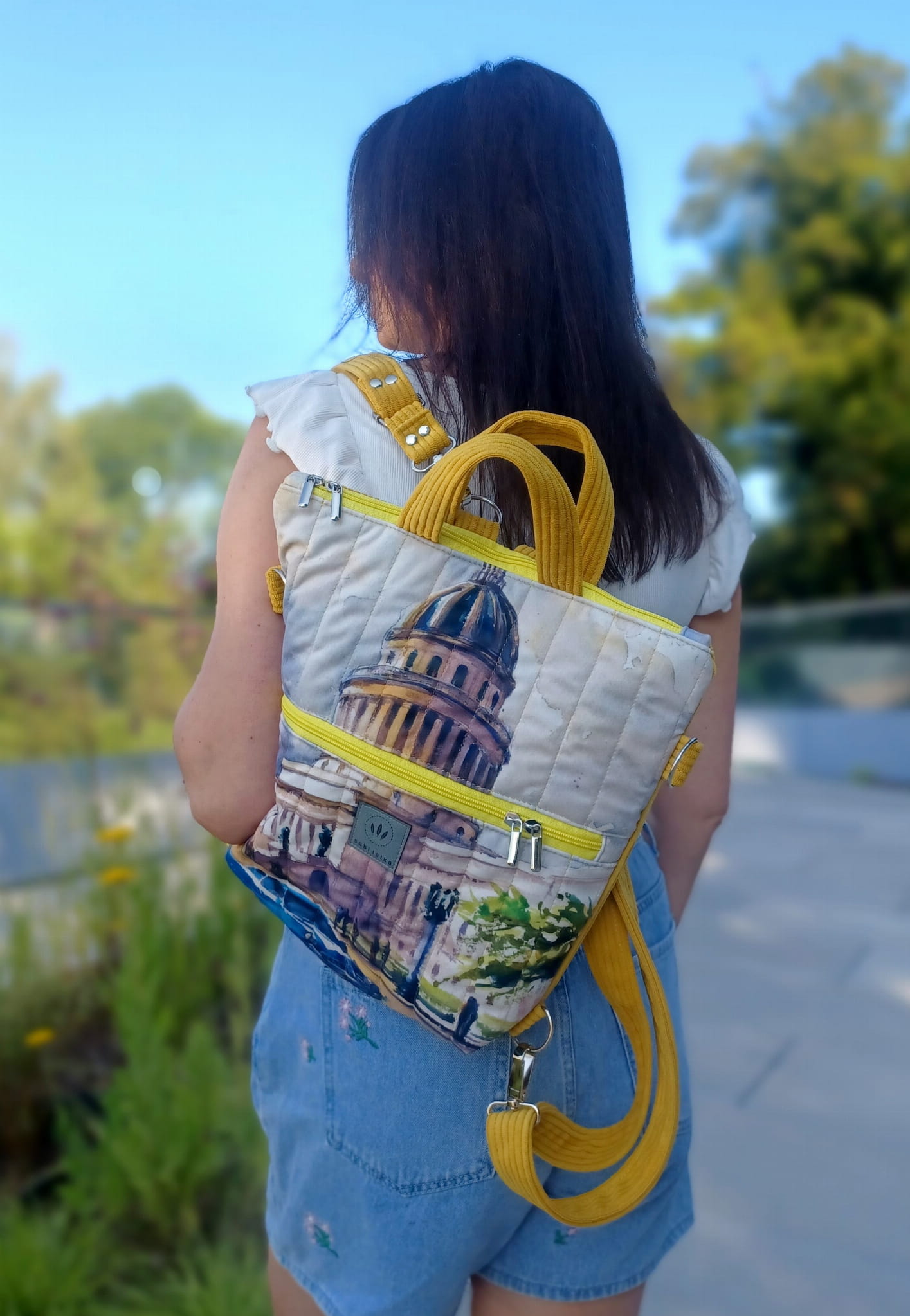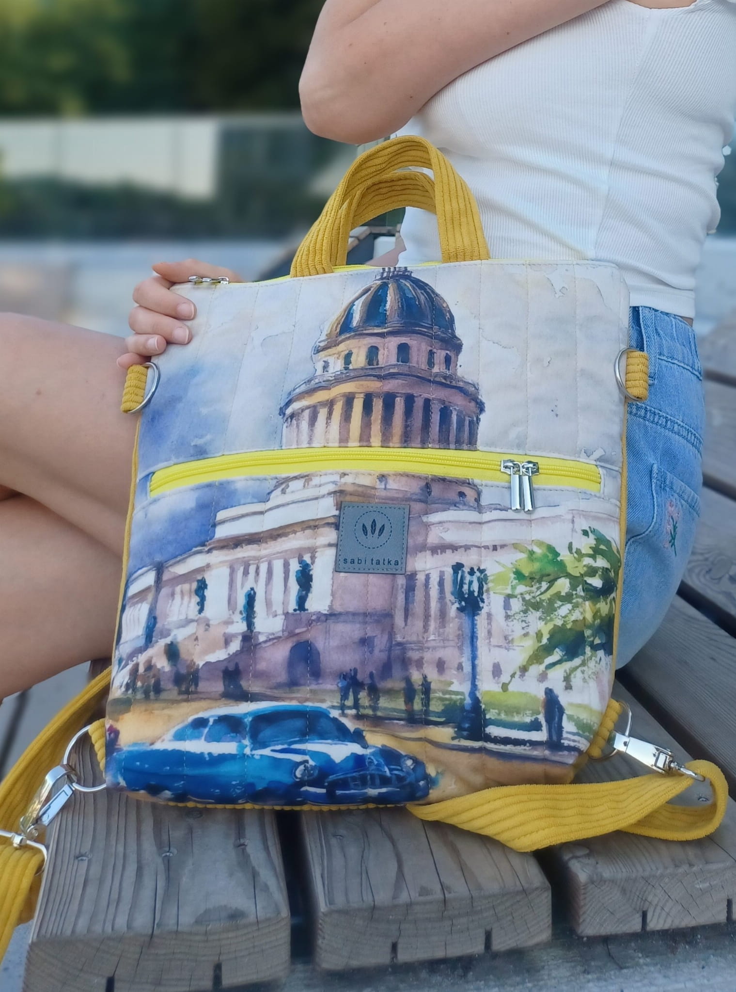Torebko-plecak może służyć jako torebka albo jak plecak po przypięciu szelek do tyłu plecaka.