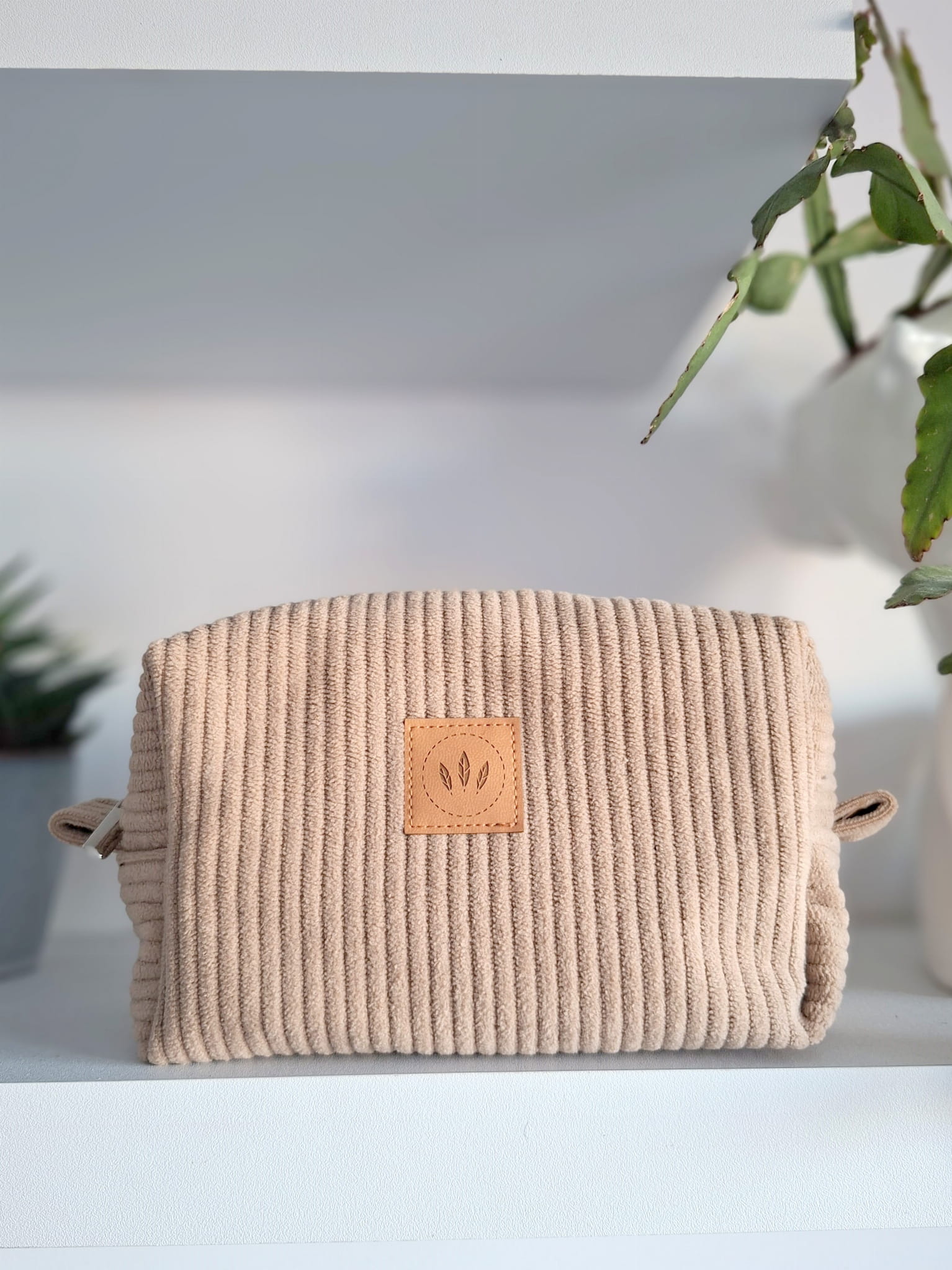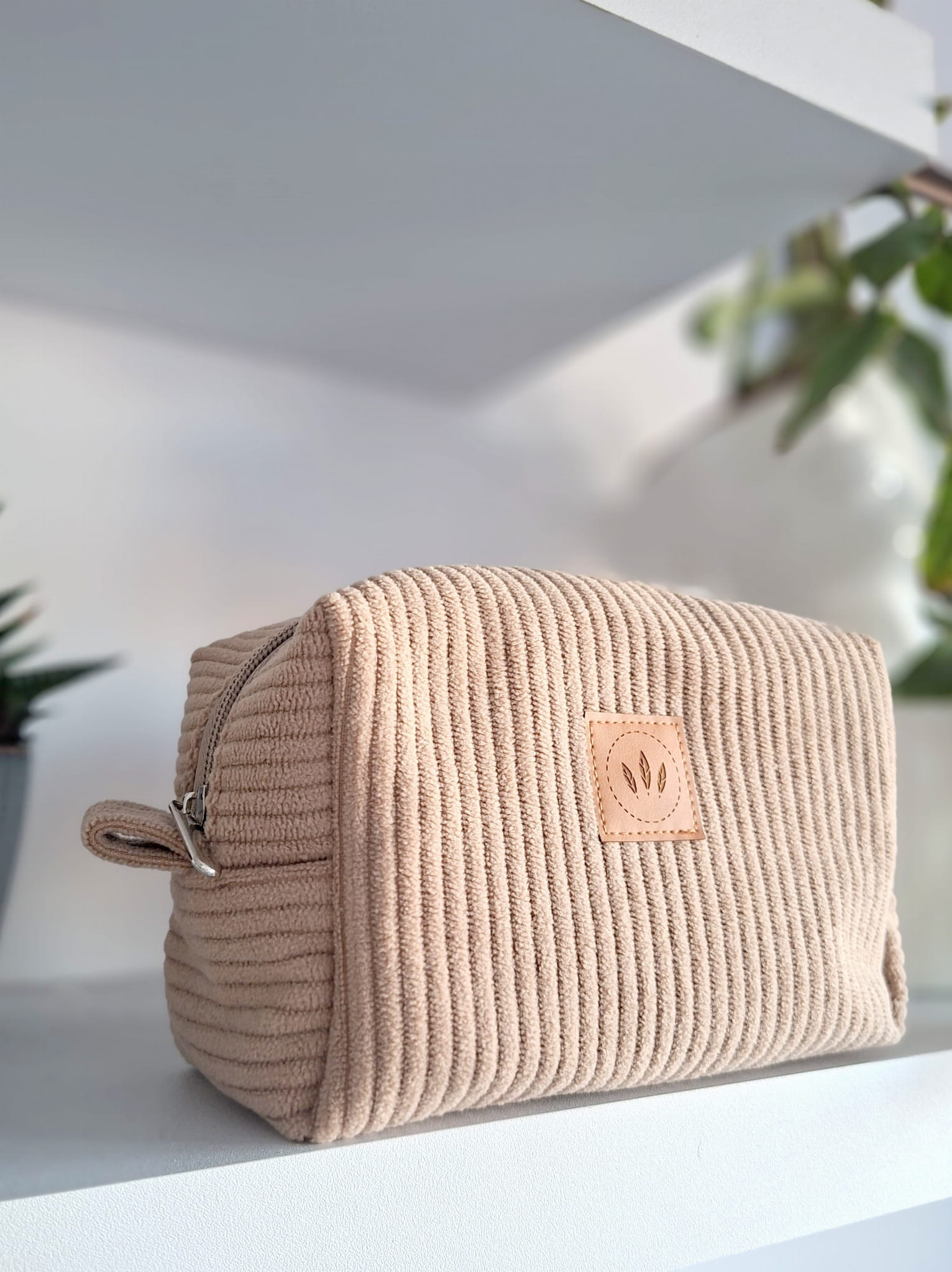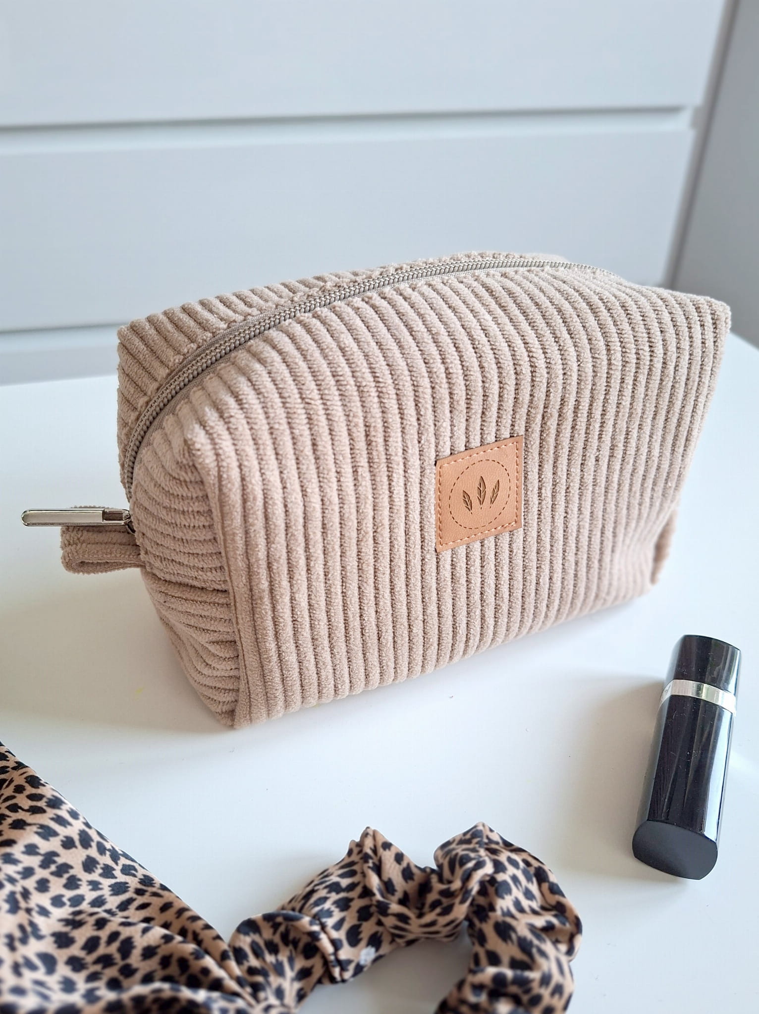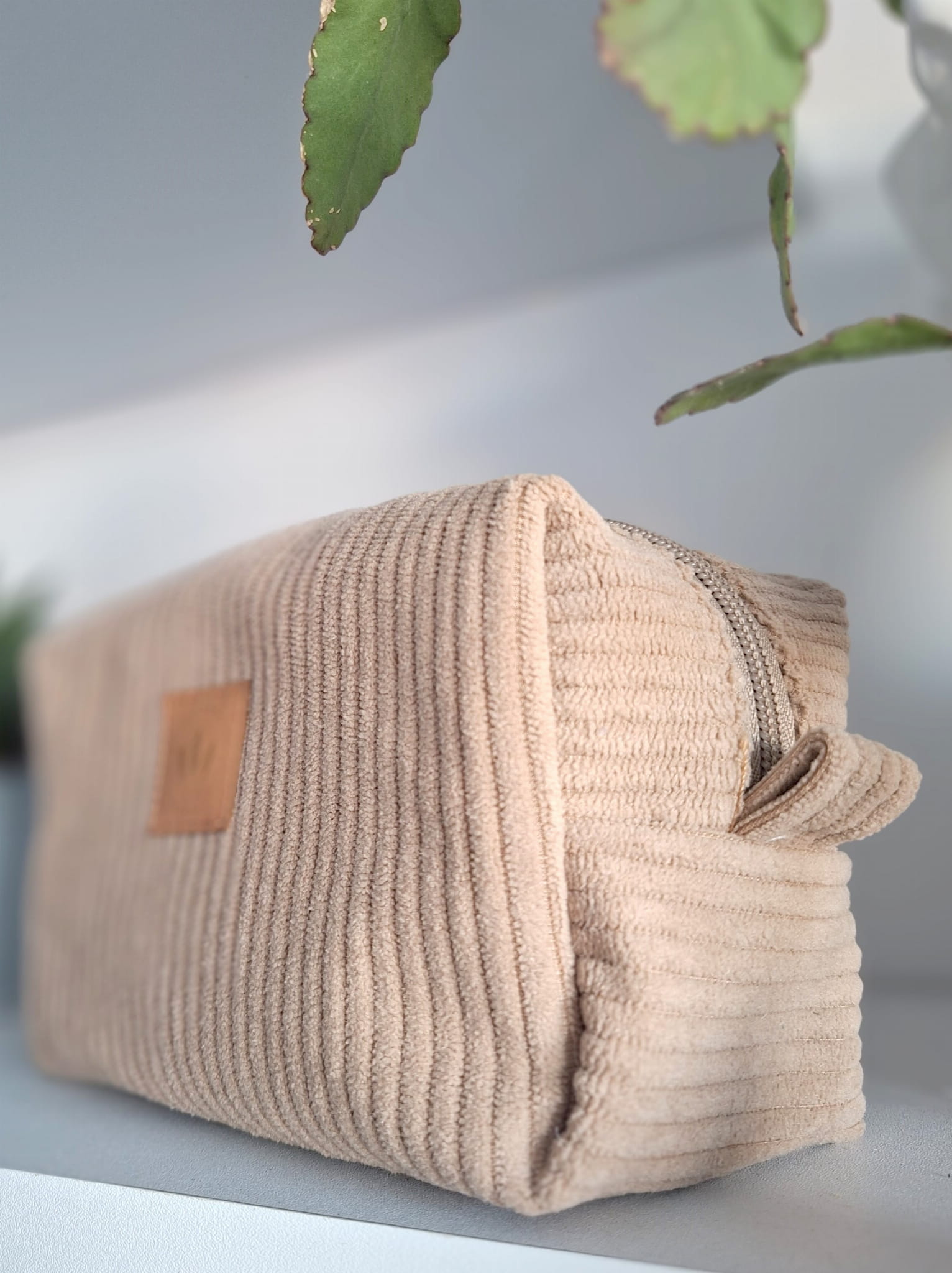 Średniej wielkości kosmetyczka z miękkiego sztruksu w drobny prążek.