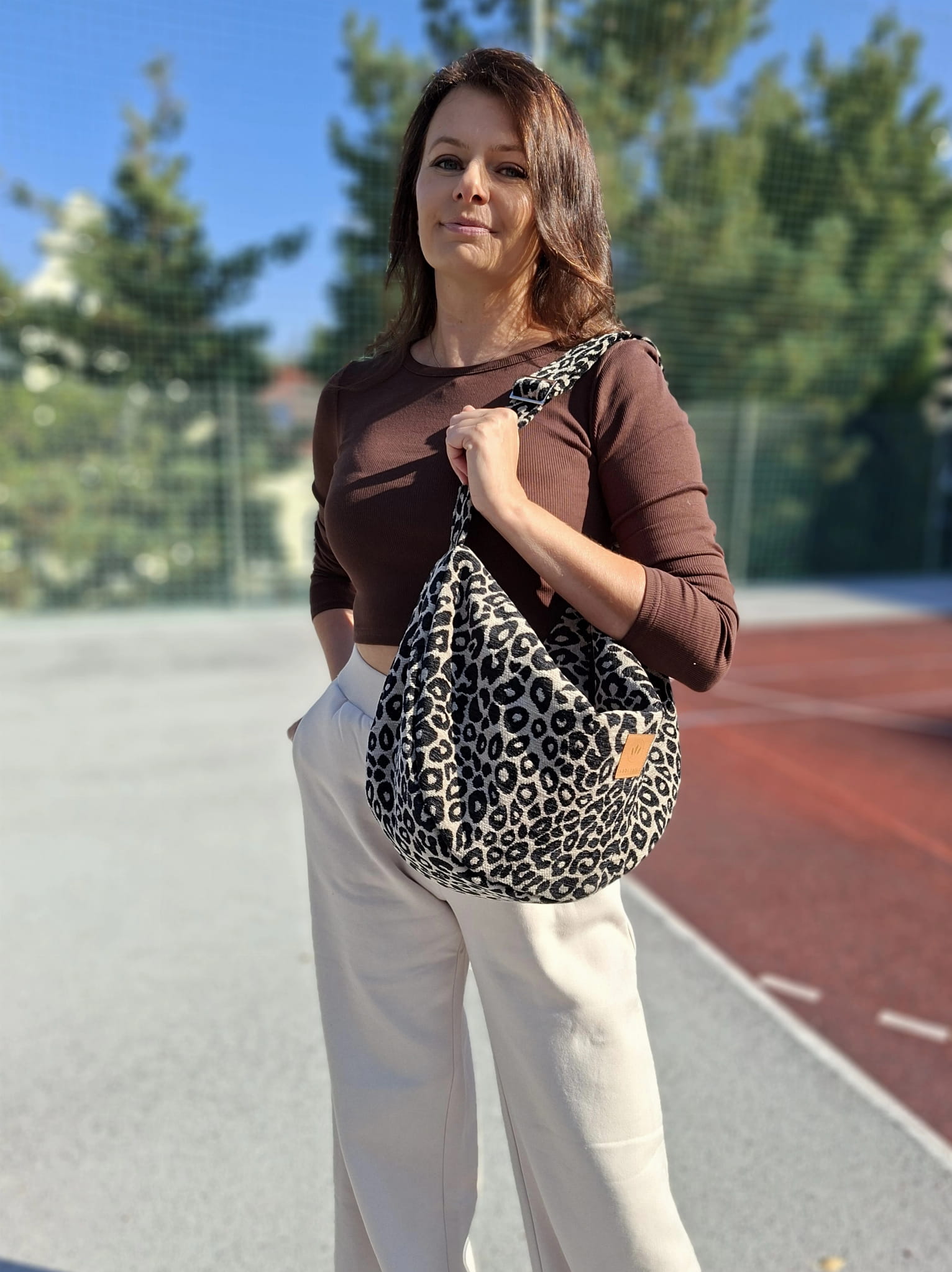 Średniej wielkości, minimalistyczna torba worek wykonana z grubej, tkanej żakardowo tkaniny z wzorem panterki.