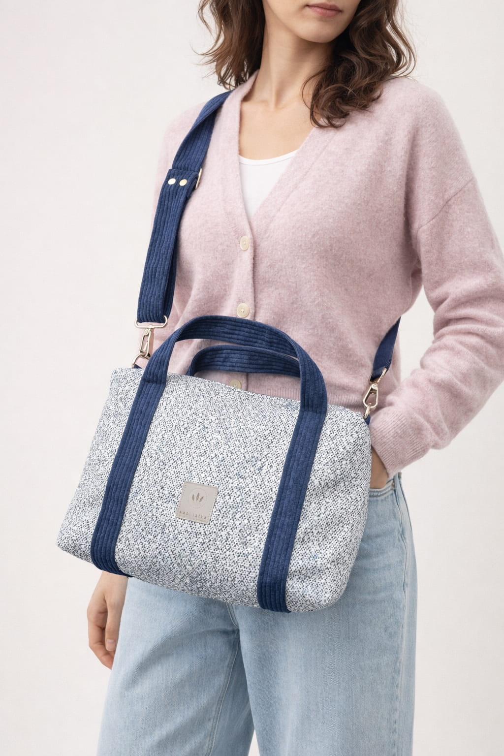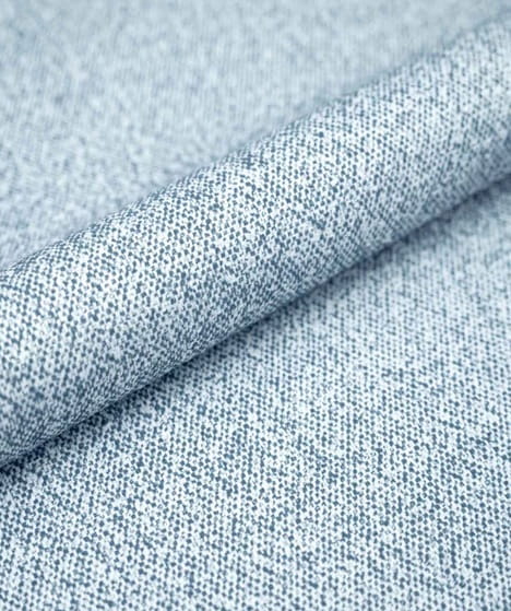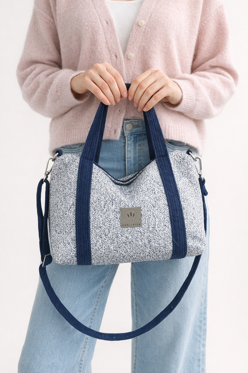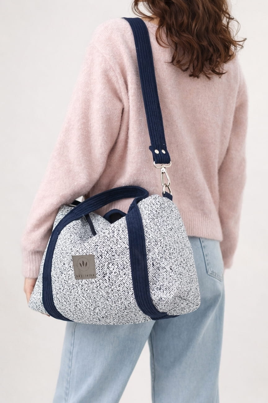 Wykonana z melanżowej, plecionej tkaniny tapicerskiej w odcieniach bieli i granatu.