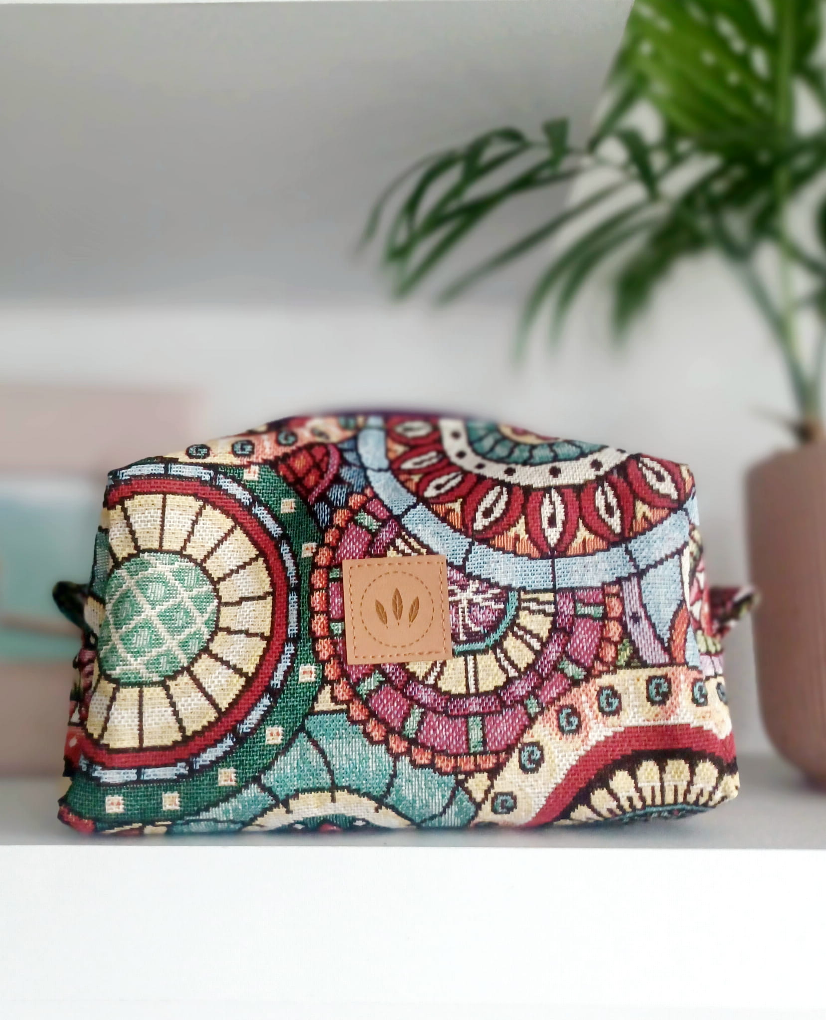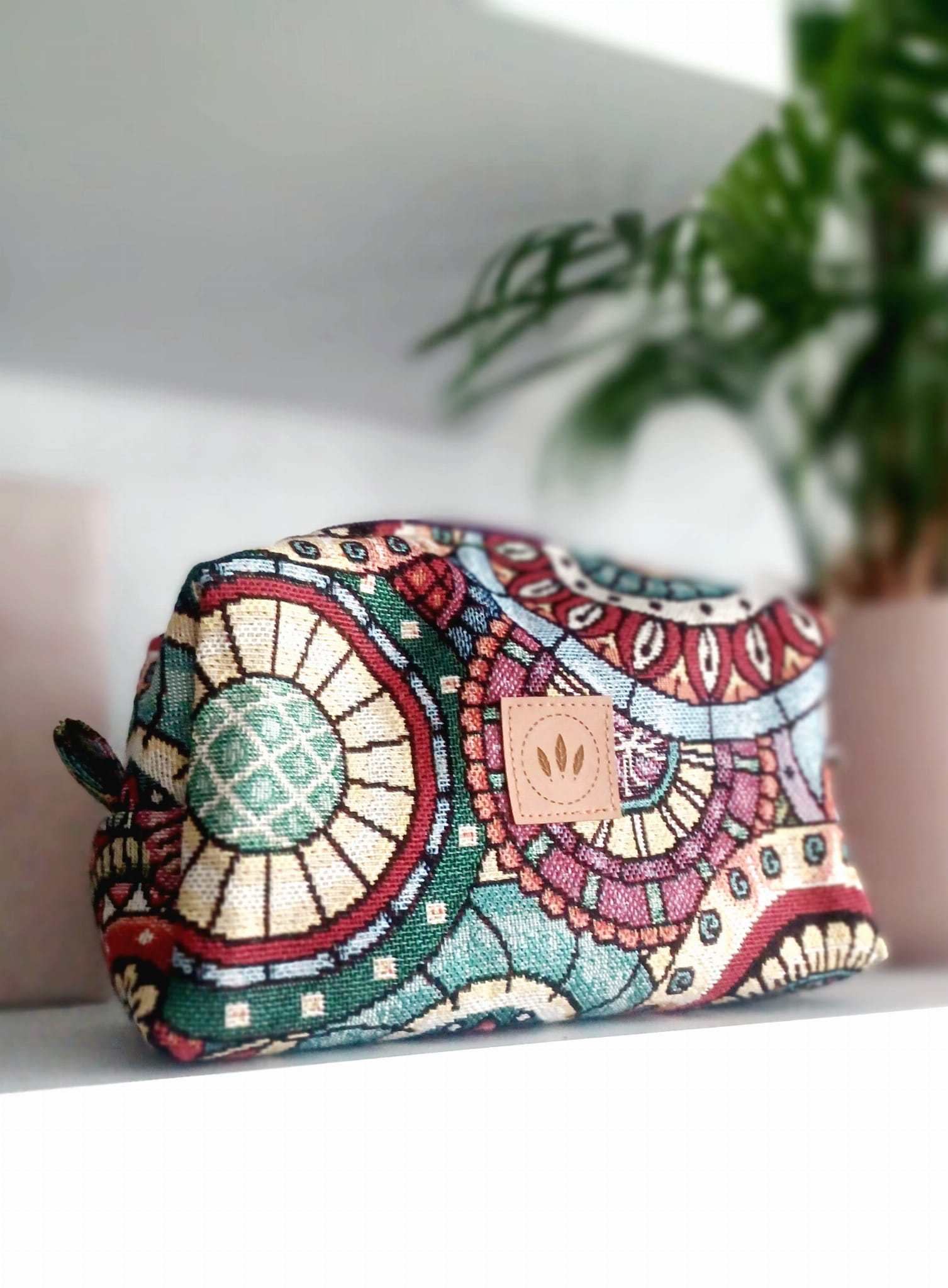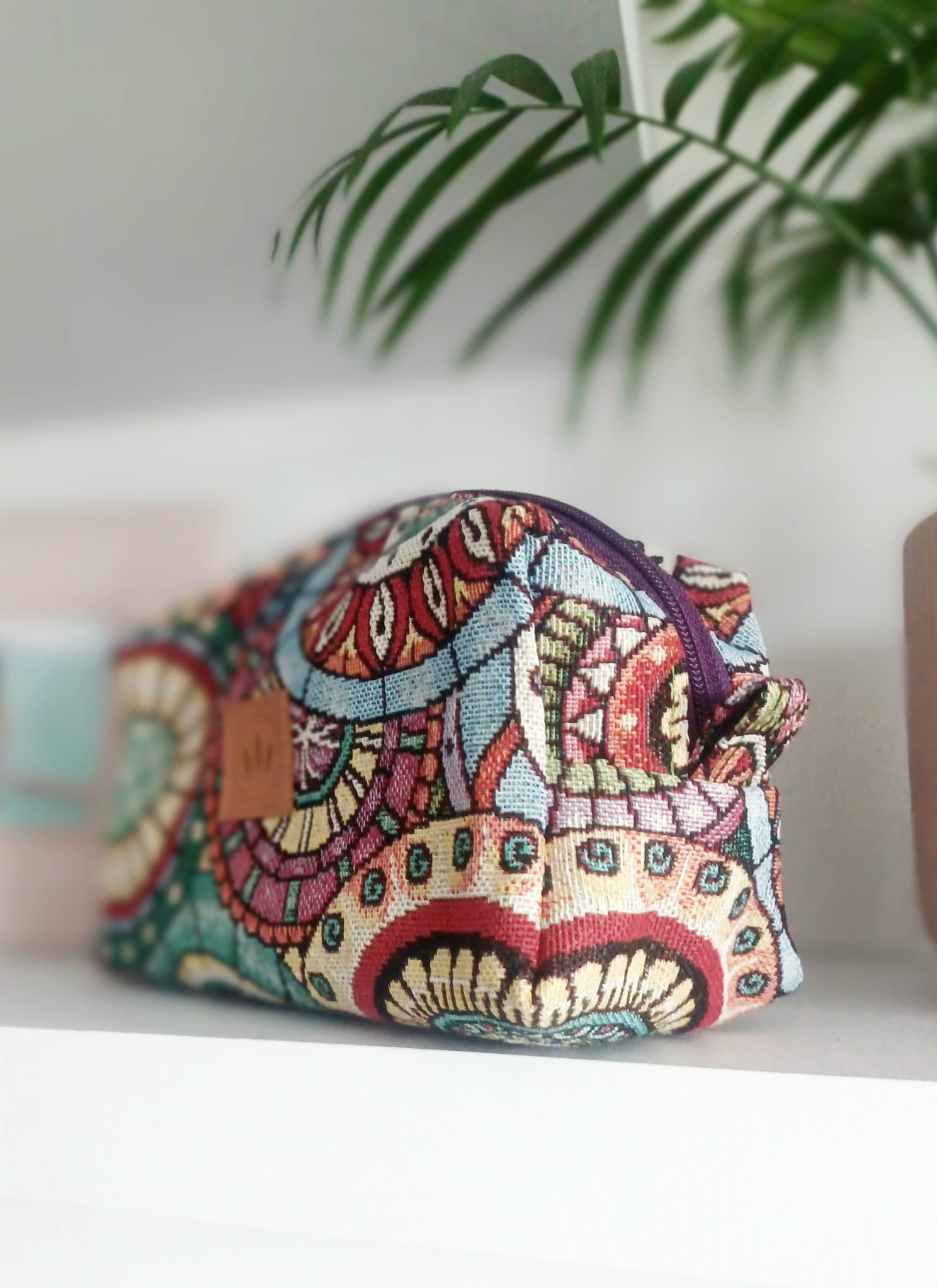 Średniej wielkości kosmetyczka z grubego żakardu z wzorem mandali.