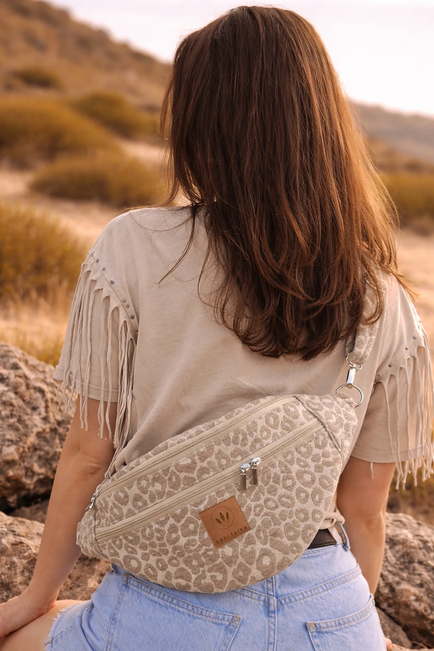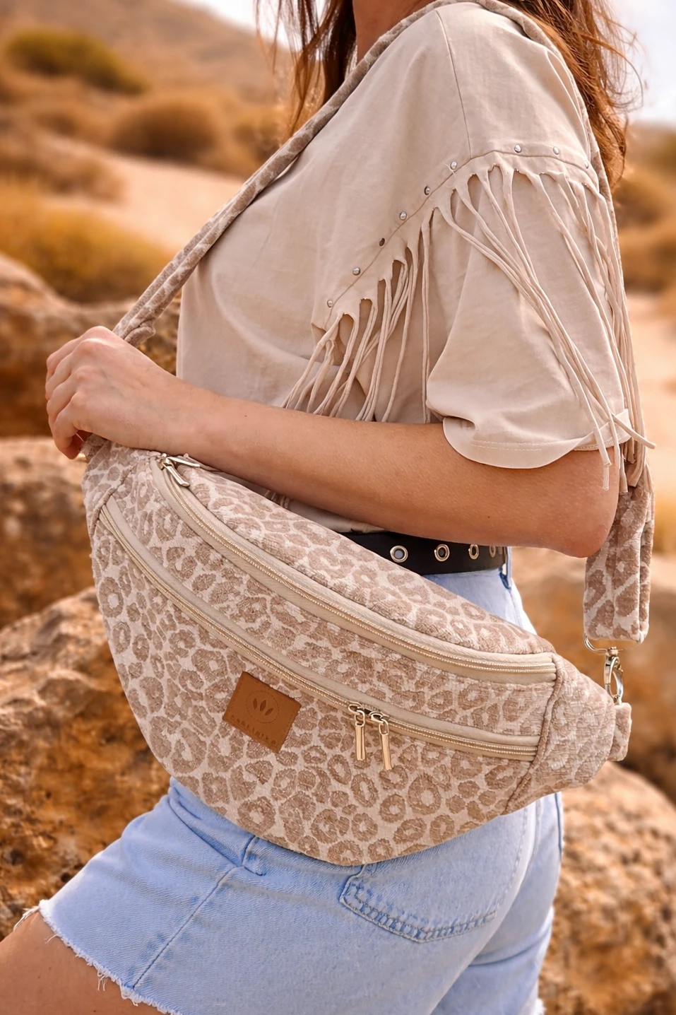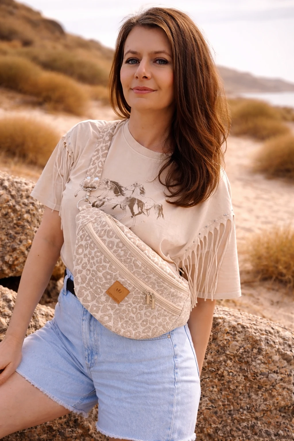 Bardzo duża nerka torebka damska z grubej, żakardowej tkaniny w panterkę.