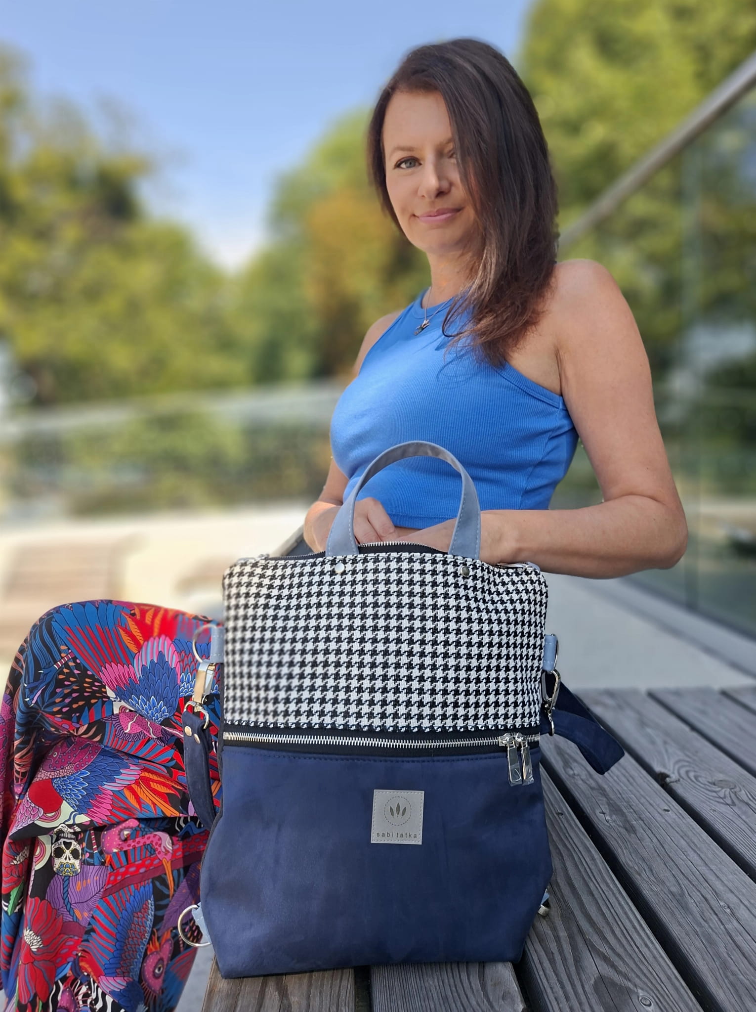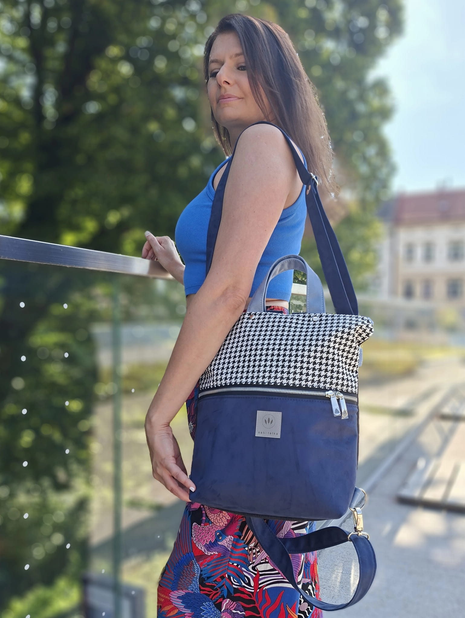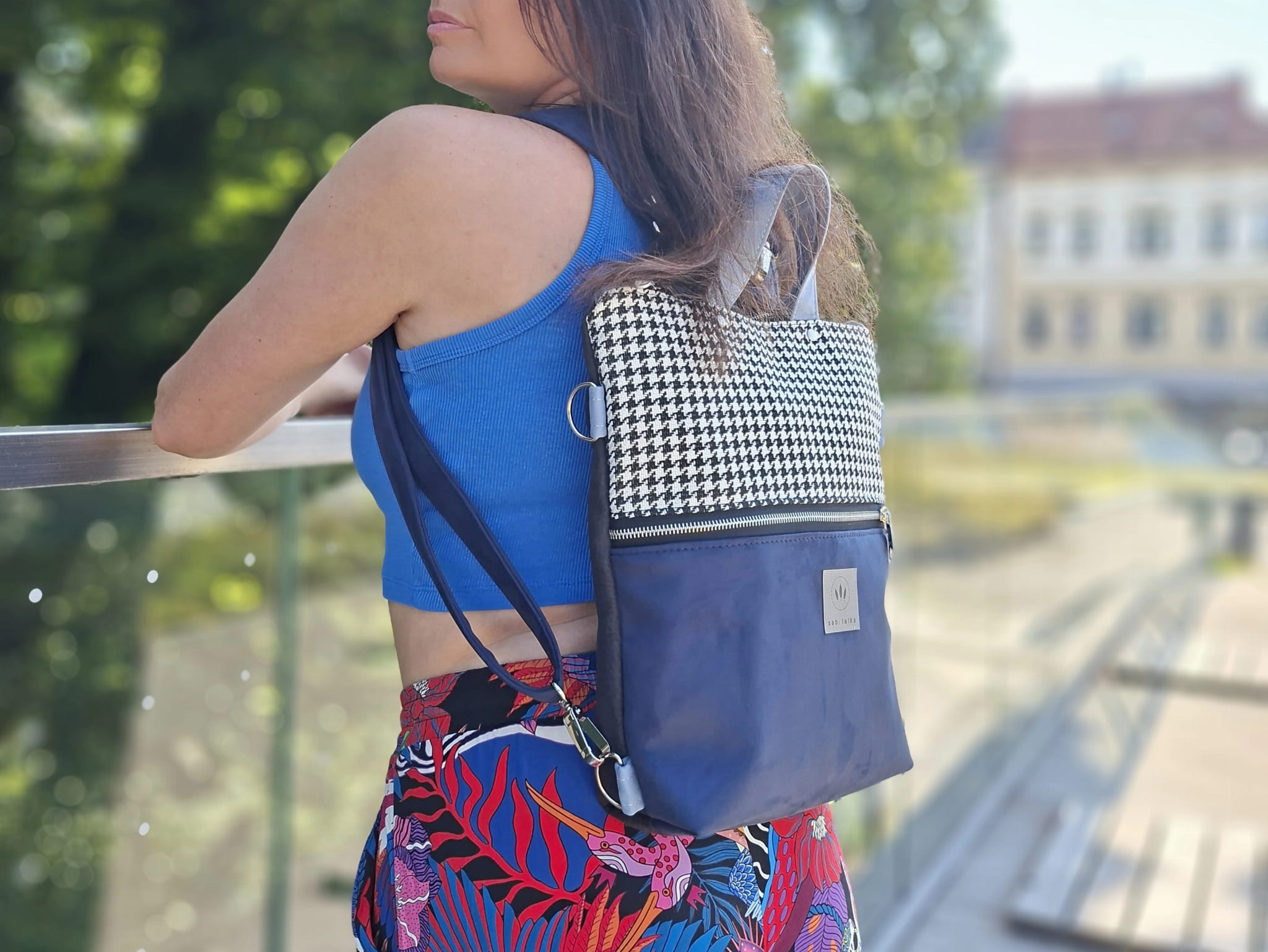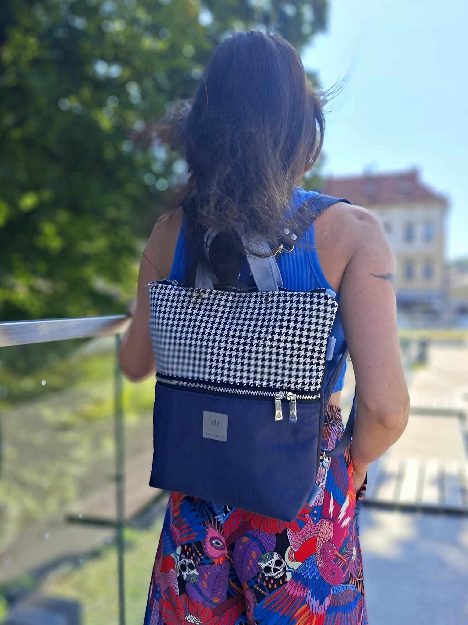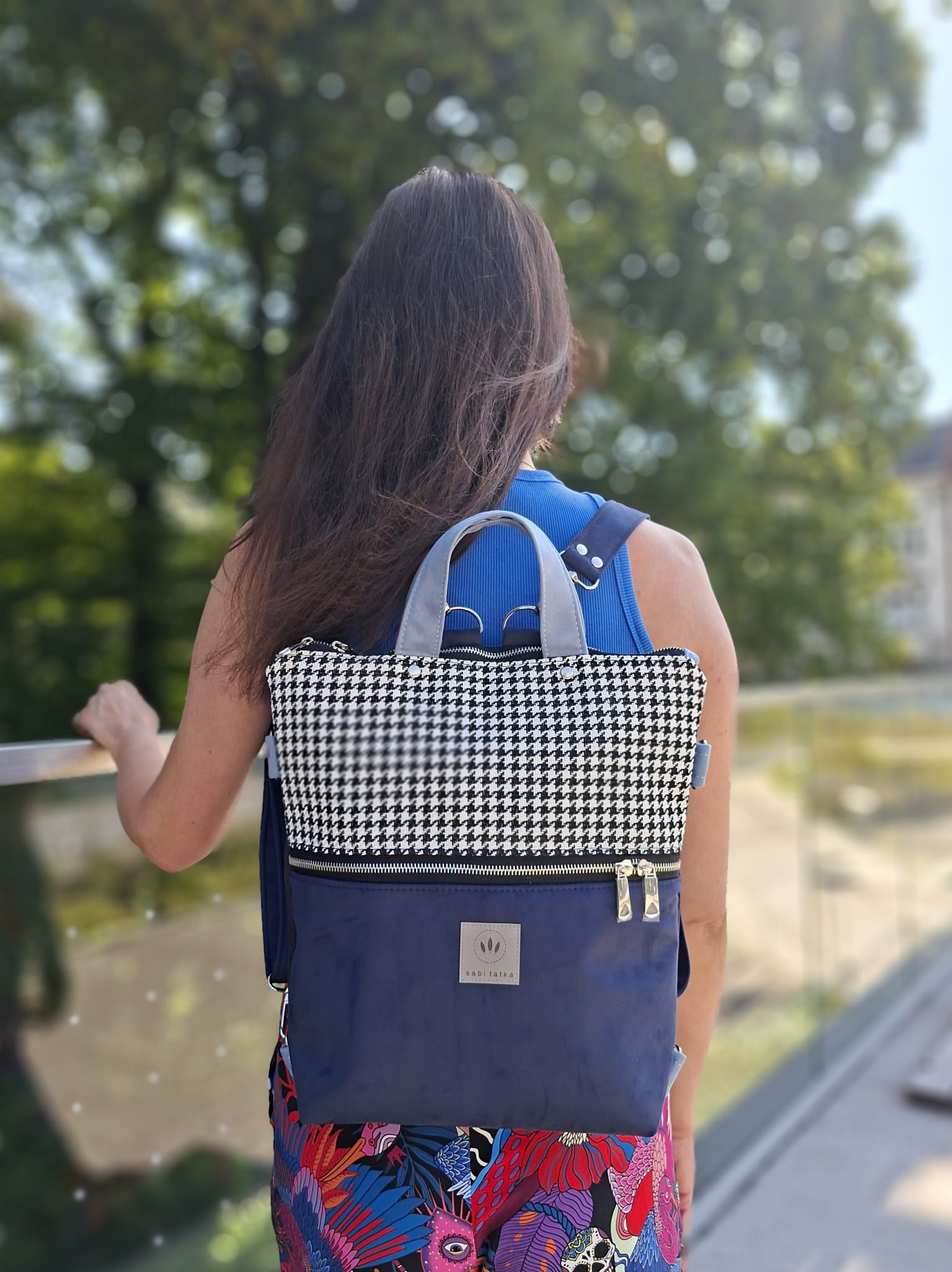 Torebko-plecak może służyć jako torebka albo jak plecak po przypięciu szelek do tyłu plecaka.