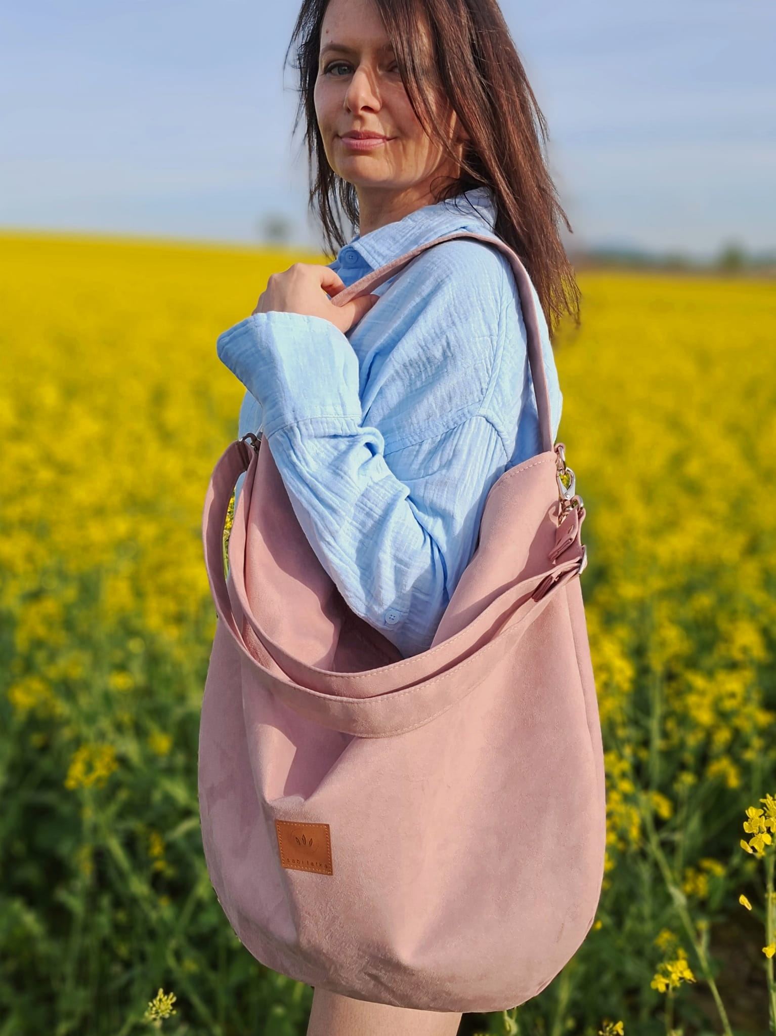 Duża torebka worek wykonana z zamszowej tkaniny do złudzenia przypominającej naturalną zamszową skórę.